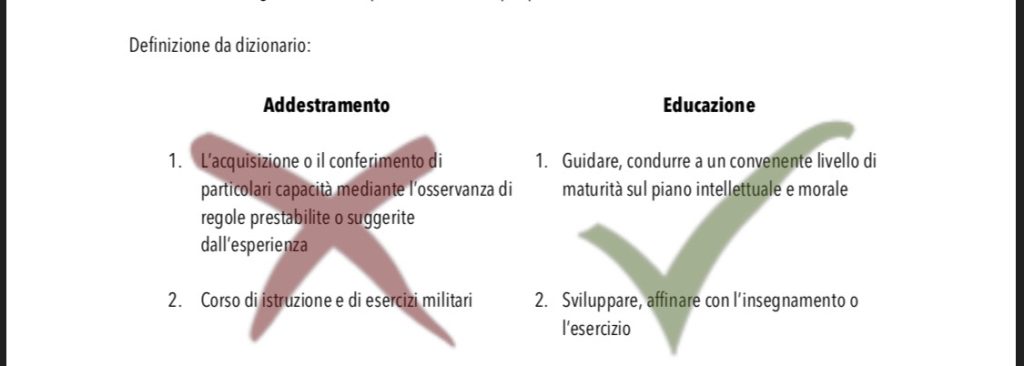 L’addestramento consiste nell’insegnare al cane un determinato lavoro e spesso con metodi non idonei, così detto coercitivi, come può essere la caccia, l’agility, attacco e difesa è tanto altro ancora per cui si ha come obiettivo l’ottenimento di una performance da parte del cane SU RICHIESTA del proprietario.